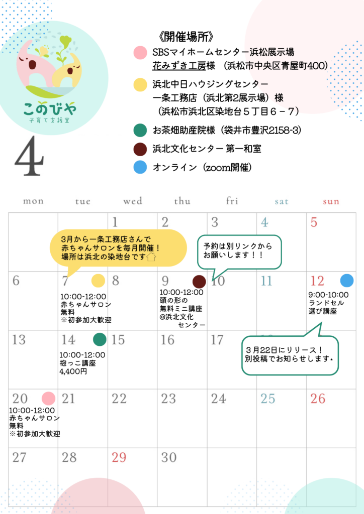 5月:抱っこ講座、お口ポカン講座、巻き巻き練習会、赤ちゃんサロンを実施予定です